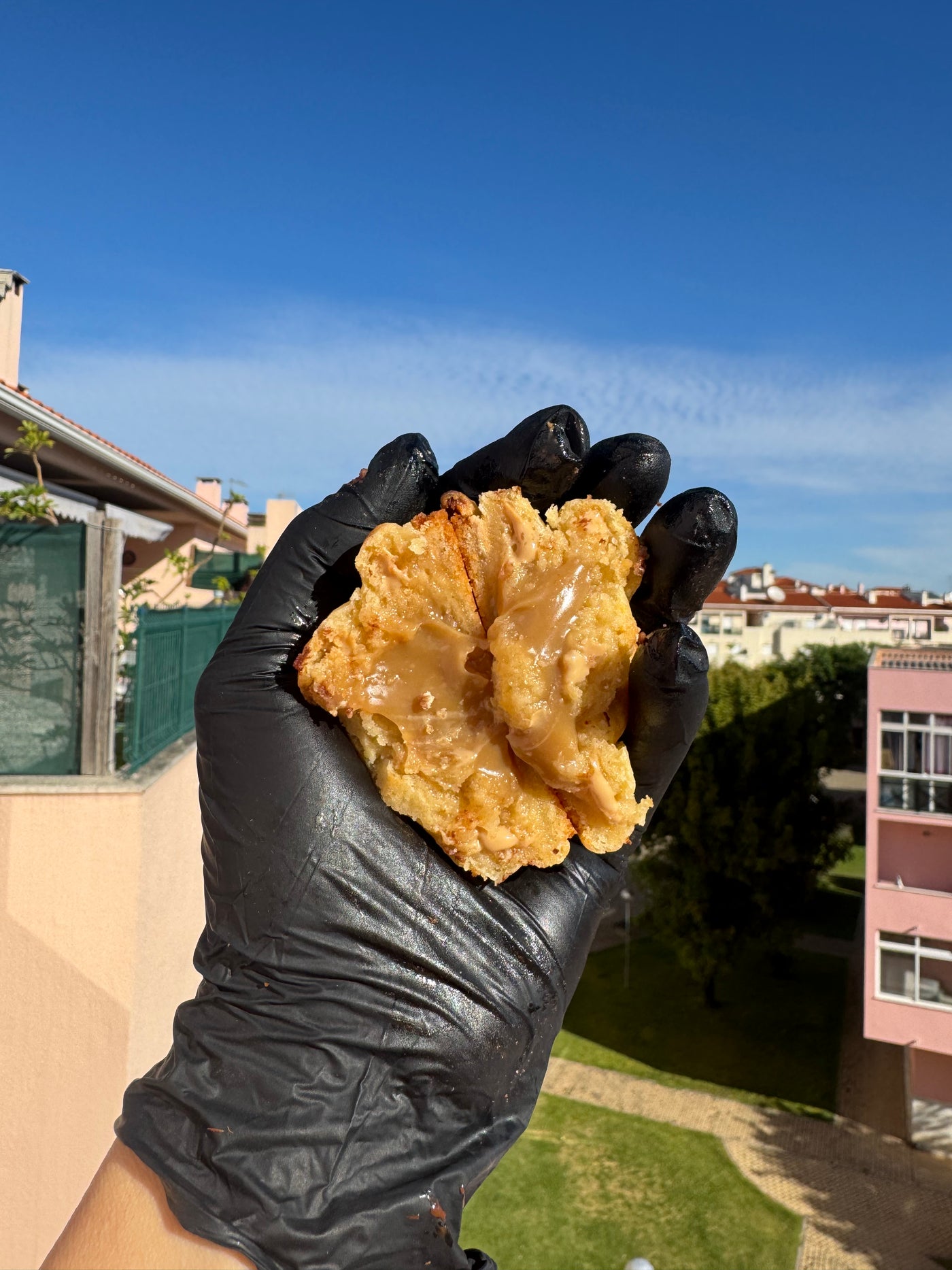 Nossos cookies, como o irresistível Cookie de Caramelo Salgado, são assados à mão na Quinta do Conde com ingredientes premium. Entregues frescos em até 24 horas em Portugal, com amor em cada mordida. ★★★★★ 100+ Avaliações! Descubra o sabor autêntico!