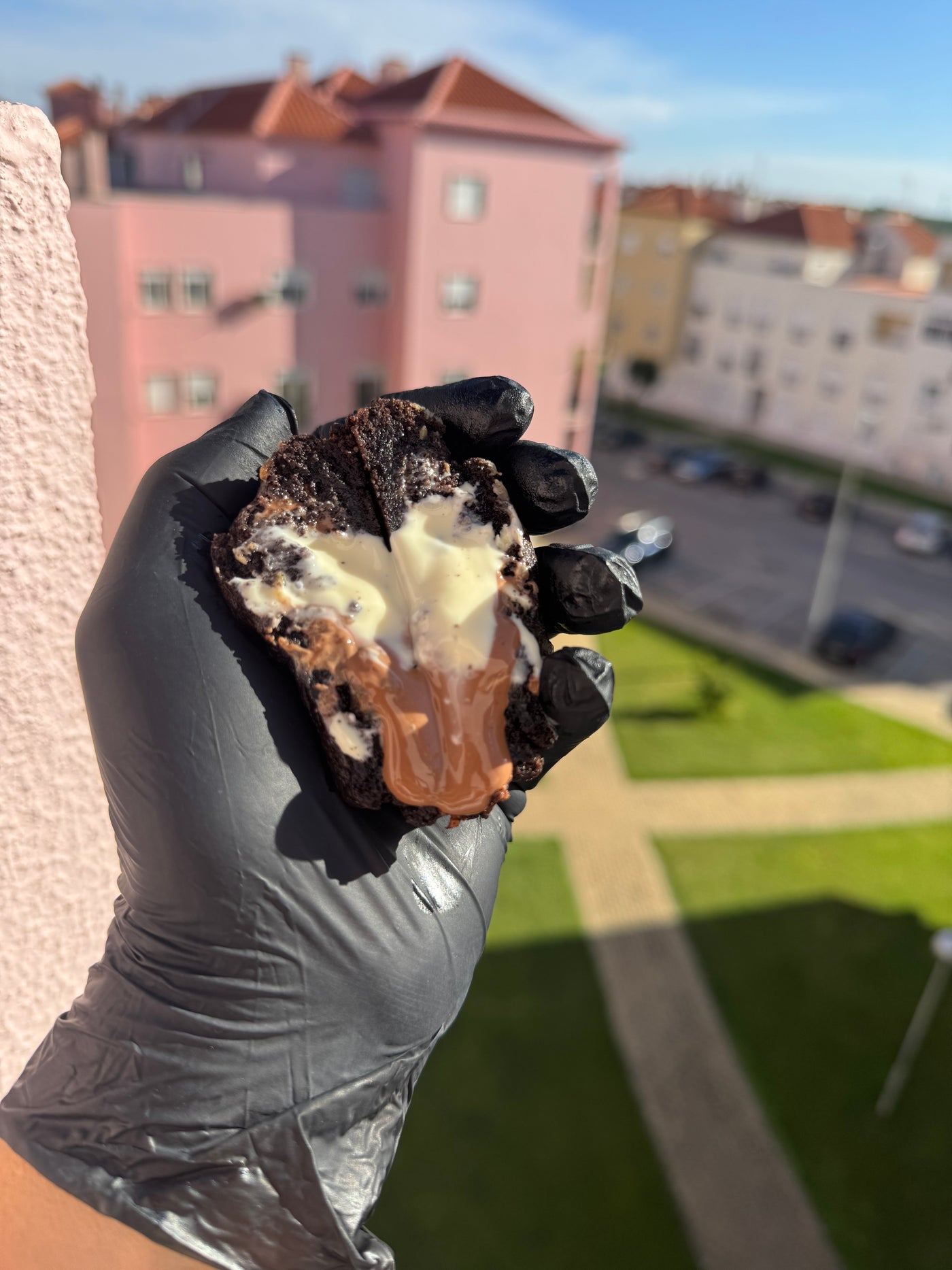 Nossos cookies, como o irresistível Cookie de Caramelo Salgado, são assados à mão na Quinta do Conde com ingredientes premium. Entregues frescos em até 24 horas em Portugal, com amor em cada mordida. ★★★★★ 100+ Avaliações! Descubra o sabor autêntico!